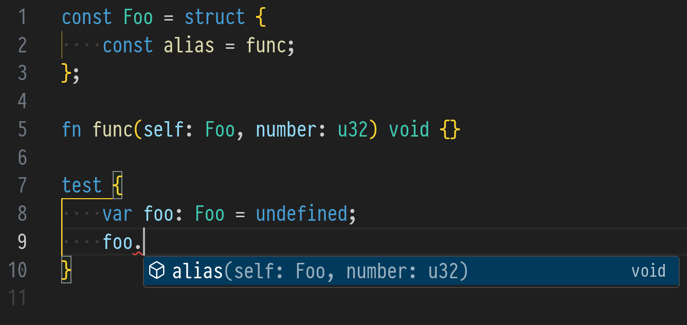 Declarations to function alias that take a self parameter are now included when providing completions on member access.